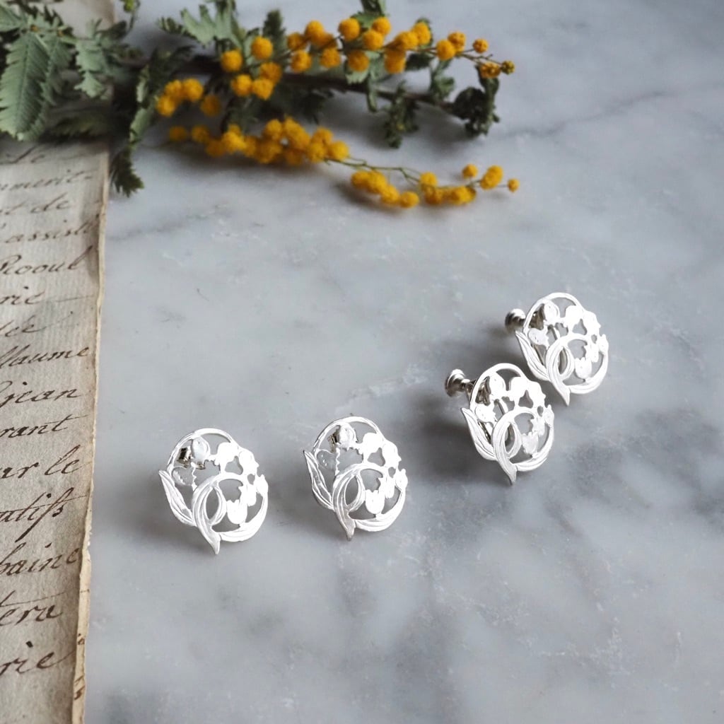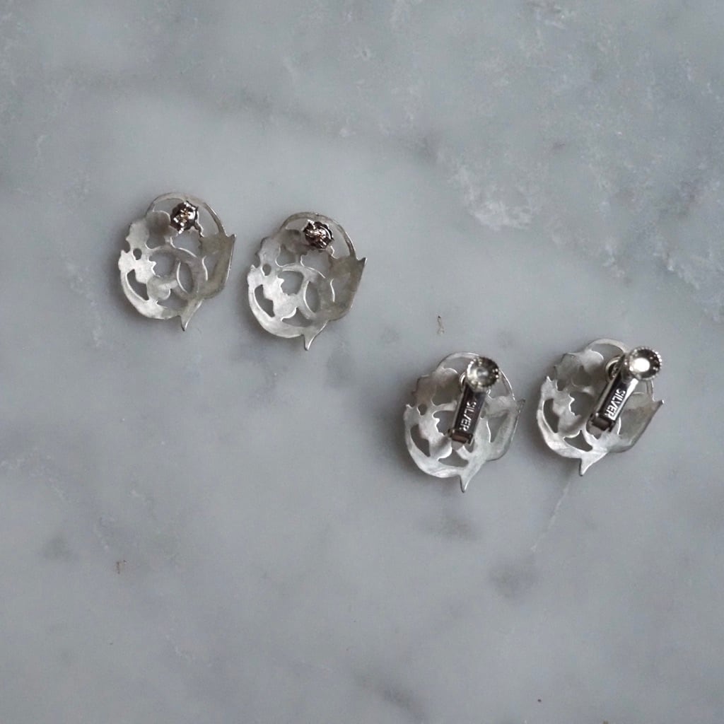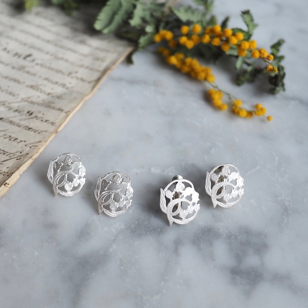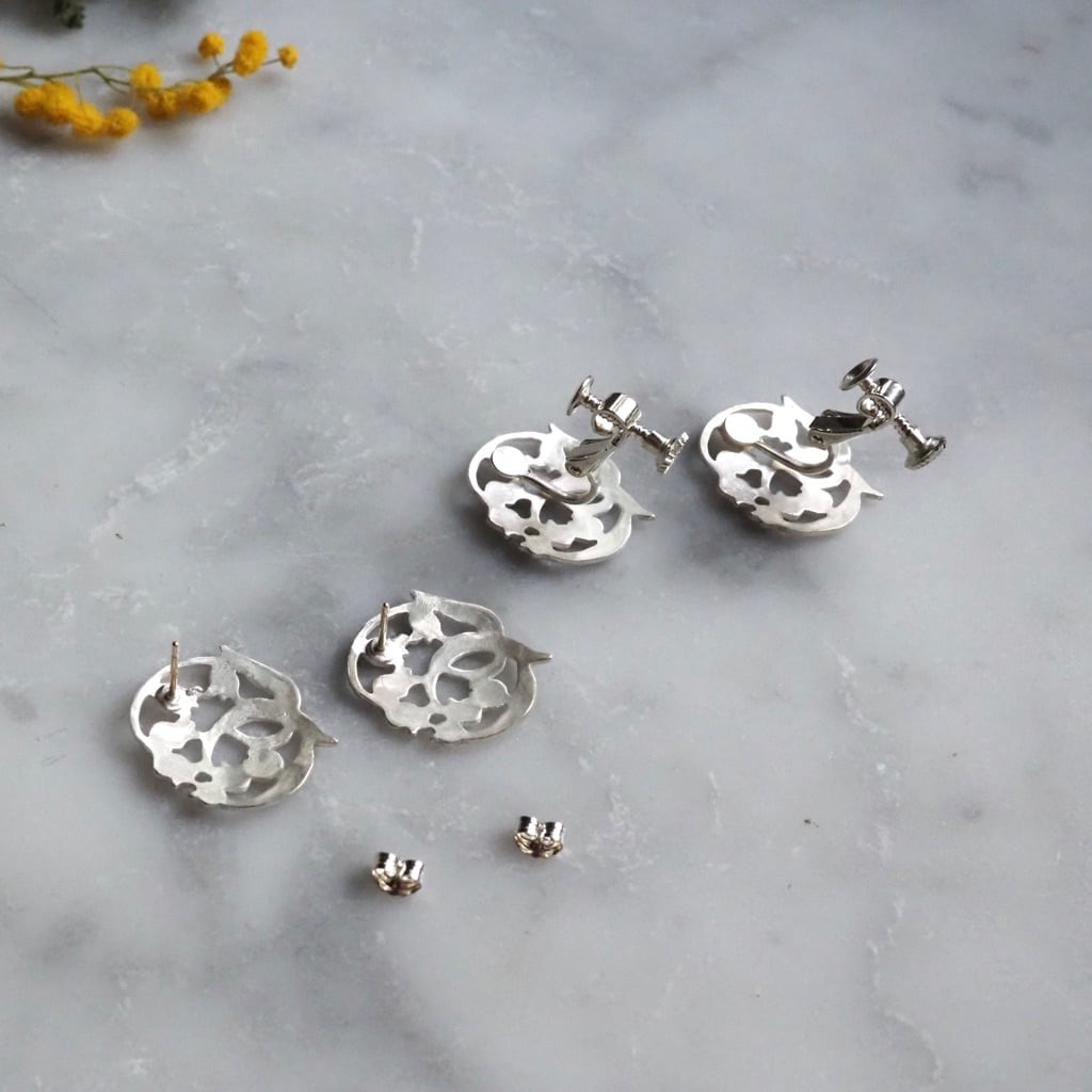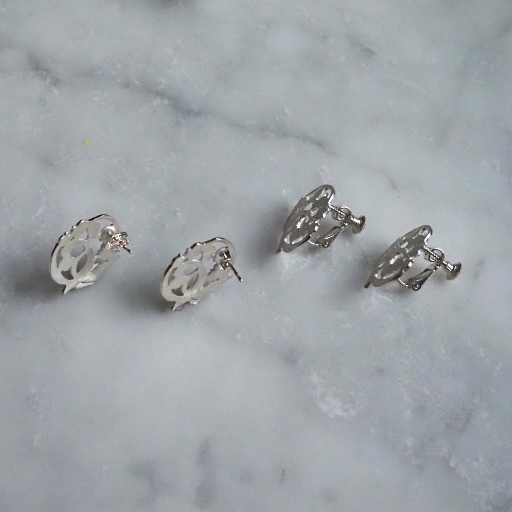 マットな白仕上げを施し、透かしたデザインが清楚なシルバーピアスとイヤリング。